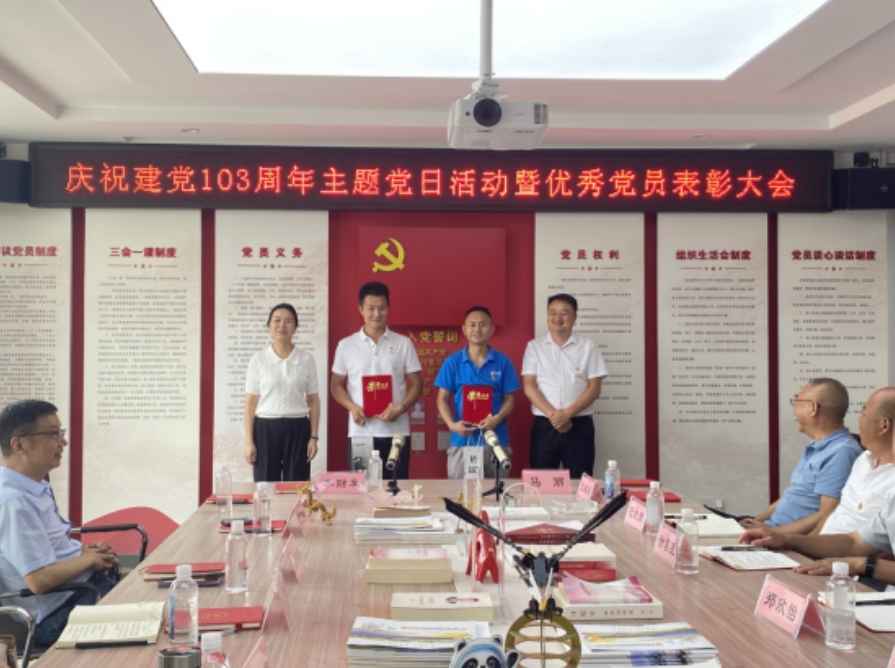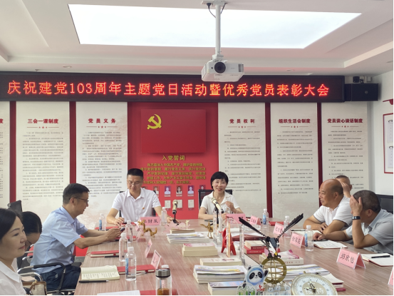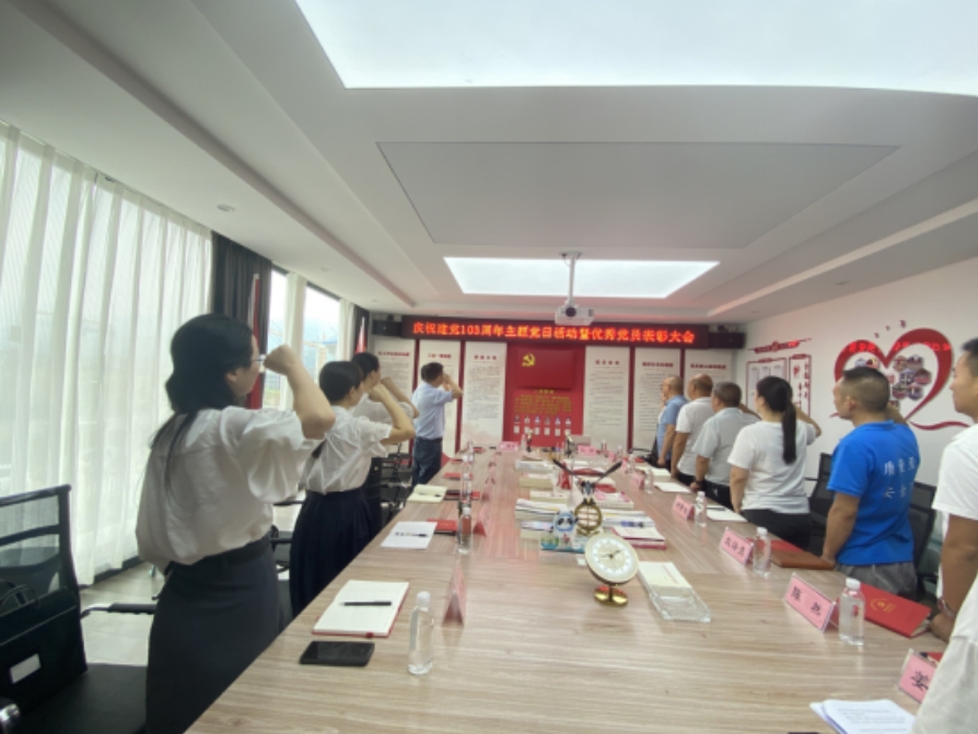 为迎接“七一”党的生日,庆祝建党103周年,弘扬党的优良传统。6月26日我党支部特组织开展“忆峥嵘岁月 看今朝辉煌”主题党日活动暨优秀党员表彰大会,本次活动有幸邀请到县委统战部赵部长、县政协民宗委武主任、县政协毛鑫、县工商联张主席、经开区社会事务中心王主任、县委党校马主任、县委组织部周小芳、县商贸联合商会徐会长、芹菜沟村张书记以及芹菜沟村支部况书记等莅临我公司指导并见证。
